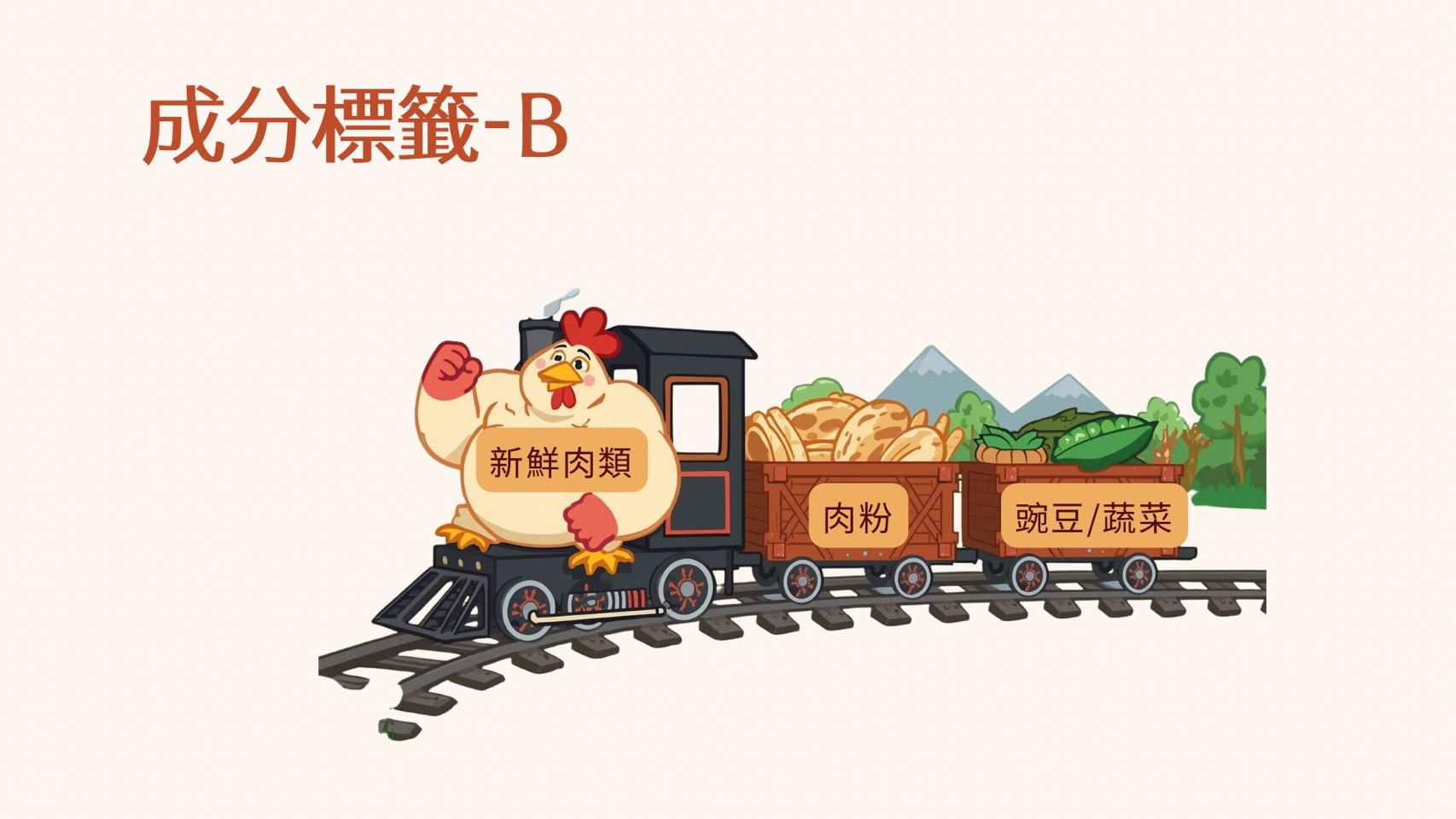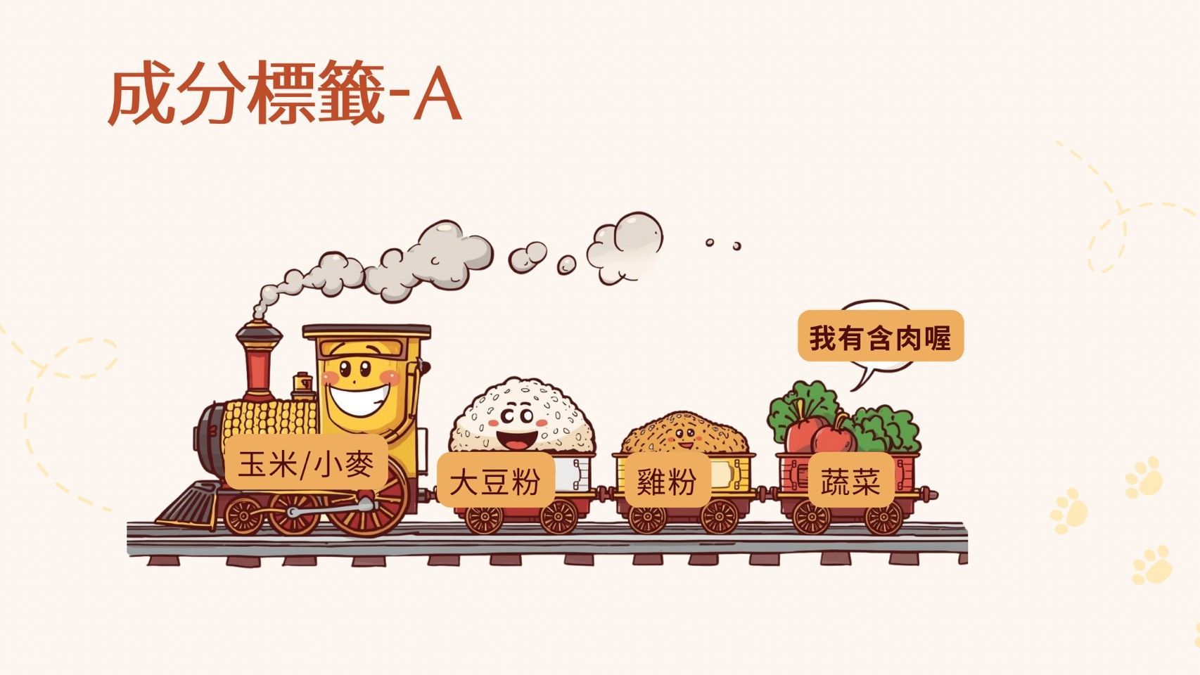 這台火車的領頭羊是「玉米/小麥」等穀類,接著是大豆粉,最後才看到雞粉與蔬菜。雖然包裝上可能寫著「含有精華肉類」,但實際比例上,它是以澱粉類為主要能量來源。